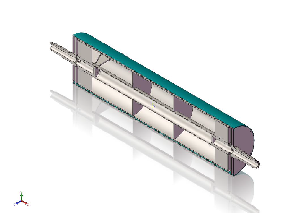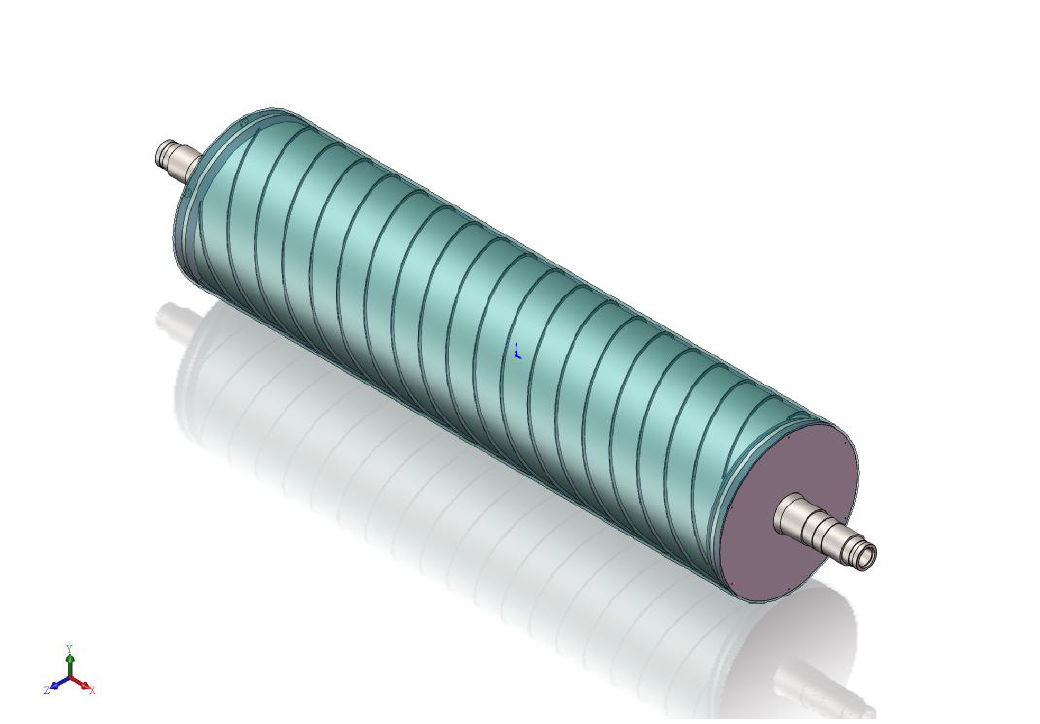雙流道大直徑流延主冷輥,包括輥筒、進水導流器、出水導流器,進水軸頭管和出水軸頭管,輥筒包括外筒、與外筒同軸設(shè)置的內(nèi)筒和在外筒、內(nèi)筒之間設(shè)置的多個螺旋導流片,相鄰兩個螺旋導流片構(gòu)成一個螺旋導流槽,進水導流器、出水導流器分別固定連接在輥筒的兩端,進水軸頭管和出水軸頭管分別安裝在進水導流器、出水導流器上。大直徑流延主冷輥,結(jié)構(gòu)簡單,由于設(shè)置了進水導流器和出水導流器,可有效降低主冷輥內(nèi)部的流動阻力,能夠使得流入輥筒內(nèi)的冷卻水量更加均勻,提高主冷輥的送水能力,提高主冷輥冷卻效率,有效提高輥筒表面的溫度均勻性,節(jié)約能耗。